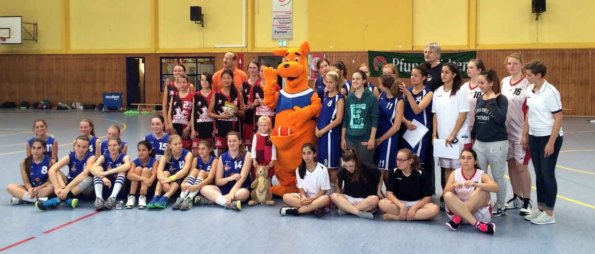 WebAls Coach kann man auf so ein TEAM (steht in blau neben dem Maskottchen) stolz sein. Es gab keine Ausfälle, jeder hat 120% Leistung gebracht. Sogar Laurén, die gerade erst mit dem Basketball angefangen hat und heute ihr erstes Spiel bestritt, war gar nicht als Anfänger zu erkennen. Ganz viel von dem, was mit dem Training seit den Osterferien bezweckt ist, wurde beim Turnier tatsächlich umgesetzt. Und es fehlten heute sogar noch ein paar Stammkräfte der U17, darunter Lisa, die zwar mit gekommen war, aber aufgrund einer Trainingsverletzung leider nicht spielen konnte. Mit Lara und Isa haben zwei aus der U15 das aber mit großem Selbstvertrauen locker kompensiert. Und da es vor allem eine tolle Teamleistung war, noch ein paar Stichpunkte zu denen, deren Name noch nichtgenannt wurde: Emily, super Defense, super Pässe, super Fastbreakeinleitung. Janin, pain-in-the-ass jedes gegnerischen Ballbesitzers und heute auch bei den Fastbreaks im Abschluß erfolgreich. Rebecca, überzeugende Leistung als Aufbau, beim Blocken von Würfen, bei den Defense-Rebounds und zeitweise auch mit Distanzwürfen erfolgreich. Kiara, trotz Familienausflug ab dem zweiten Spiel dabei, fand sich schnell ins Turnier und kam mit ihrer eher ungewohnten Rolle in der Defense ausgezeichnet zurecht.